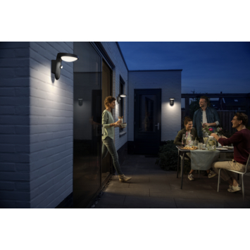 De Philips Tyla LED buitenwandlamp met geïntegreerde bewegingssensor geeft automatisch warmwit licht bij beweging in de avond en is overdag uit. Deze antracietkleurige wandlamp is gemaakt van aluminium en is weerbestendig (IP44). Geniet van gezellige buitenverlichting met deze praktische Philips LED-lamp.