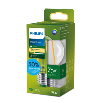 Deze peervormige Philips UltraEfficient LED filamentlamp met energielabel A behoort tot onze meest energiezuinige lampen ooit. Door 50% minder energieverbruik én een 3,5x langere levensduur dan de gemiddelde LED-lamp bespaar je nóg meer kosten op je energierekening. Omdat deze lamp tot 50 jaar meegaat verspil je ook minder materiaal waardoor je eenvoudig bijdraagt aan een beter klimaat; met LED kan het! Deze lamp met E27-fitting geeft gezellig warmwit licht voor een fijne sfeer.