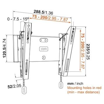 Deze kantelbare TV steun komt slechts 5,2 cm van de wand. Deze TV steun is geschikt voor een platte LCD, LED en Plasma TV van 48cm tot 102 cm of van 19" tot 40". Deze maten worden diagonaal gemeten. Het maximale gewicht van de TV is 20kg. Met deze TV steunen worden alle bevestigingsmaterialen meegeleverd. De maximale bevestigingsmaten van de TV zijn 200 x 200mm.