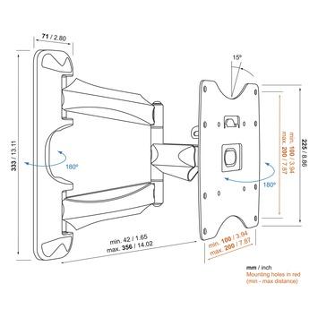 Deze draai- en kantelbare TV steun komt slechts 4,2 cm van de wand. Deze TV steun is geschikt voor een platte LCD, LED en Plasma TV van 48cm tot 94 cm of van 19" tot 37". Deze maten worden diagonaal gemeten. Het maximale gewicht van de TV is 20kg. Met deze TV steunen worden alle bevestigingsmaterialen meegeleverd. De maximale bevestigings maten van de TV zijn 200 x 200mm.