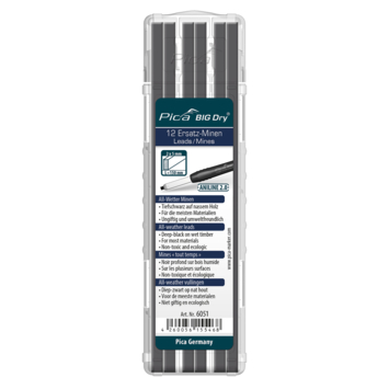 Maak gebruik van de innovatieve ANILINE 2.0 vullingen met de Pica BIG Dry 6060 markeerpotlood navulling. Deze set van 12 grafietvullingen is speciaal ontworpen voor het markeren van nat hout, waarbij ze diepe, zwarte lijnen achterlaten voor maximale zichtbaarheid en precisie.