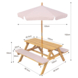 Met deze tafel richt je eenvoudig een leuke speel- of eethoek in voor je kinderen, ideaal voor tuin, balkon of terras. Het formaat is ideaal voor kleine kinderen, maar biedt ook voldoende ruimte voor creativiteit en plezier. Inclusief parasol en kussens voor comfort en schaduw tijdens zonnige dagen.