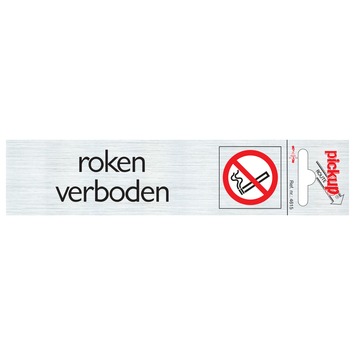 Het Pickup Alu deurbordje verboden te roken 165x44mm is zelfklevend. Daardoor brengt u het deurbordje eenvoudig aan. De aluminiumlook geeft dit bordje een luxe, moderne en tijdloze uitstraling. Het bordje heeft een duidelijk pictogram en een goed leesbare tekst. Zo communiceert u uw boodschap helder. Dit deurbordje maakt deel uit van een serie die bestaat uit diverse producten waarmee u eenvoudig richting of andere signalen kunt communiceren. Het Pickup Alu deurbordje verboden te roken is snel te bevestigen en geeft duidelijk aan dat er op de betreffende plek niet mag worden gerookt.. Afmeting: 165mm breed en 44mm hoog.