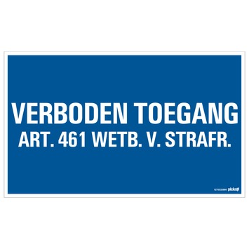 Dit Pickup bord verboden toegang artikel 461 33x20cm is gemaakt van polystyreen en maakt deel uit van een serie speciaal ontwikkelde borden voor aanduidingen op het gebied van verbod, gebod en waarschuwing. Het blauw met witte, rechthoekige bord bevat een duidelijk leesbare tekst (met toevoeging van het betreffende wetsartikel). U kunt het kwalitatief hoogwaardige bordje eenvoudig bevestigen met schroeven of montagelijm. Dit Pickup bord verboden toegang waarschuwt mensen dat zij de betreffende locatie niet mogen betreden. Afmetingen: 33cm breed en 20cm hoog.