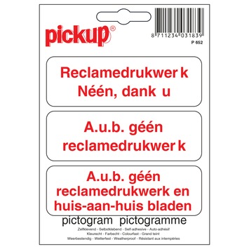 Het Pickup pictogram geen reclame 10x10cm zijn drie zelfklevende vinyl stickers. De rood met witte stickers zijn zowel binnen als buiten te gebruiken, zo lang je deze op een glad oppervlak bevestigt. De stickers hechten uitstekend, maar zijn ook goed te verwijderen zonder lijmresten achter te laten. Deze stickers maken deel uit van een assortiment Pickup stickers. Deze bieden duidelijkheid op het gebied van gebod, verbod, veiligheid, waarschuwing, brandbestrijding, vluchtweg of andere informatie. Handig voor hobby, kantoor of thuis, of puur ter decoratie. Kortom, het Pickup pictogram geen reclame maakt duidelijk dat je geen reclamedrukwerk wilt ontvangen. Afmetingen: 10cm breed en 3cm hoog (3 maal).