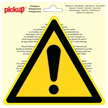 Het Pickup pictogram gevaar 20cm is een zelfklevende vinyl sticker. De geel met zwarte, driehoekige sticker is zowel binnen als buiten te gebruiken, zo lang u deze op een glad oppervlak bevestigt. De sticker hecht uitstekend, maar is ook goed te verwijderen zonder lijmresten achter te laten. Deze sticker maakt deel uit van een assortiment Pickup stickers. Deze bieden duidelijkheid op het gebied van gebod, verbod, veiligheid, waarschuwing, brandbestrijding, vluchtweg of andere informatie. Voor elk probleem is een passende oplossing te vinden. Kortom, het Pickup pictogram gevaar waarschuwt voor gevaar. Afmetingen: 20cm.