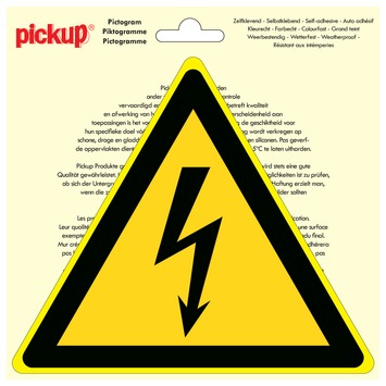 Het Pickup pictogram gevaar elektrische spanning 20x20cm is een zelfklevende vinyl sticker. De zwart met gele, driehoekige sticker is zowel binnen als buiten te gebruiken, zo lang je deze op een glad oppervlak bevestigt. De sticker hecht uitstekend, maar is ook goed te verwijderen zonder lijmresten achter te laten. Deze sticker maakt deel uit van een assortiment Pickup stickers. Deze bieden duidelijkheid op het gebied van gebod, verbod, veiligheid, waarschuwing, brandbestrijding, vluchtweg of andere informatie. Voor elk probleem is een passende oplossing te vinden. Kortom, het Pickup pictogram gevaar elektrische spanning waarschuwt voor de aanwezigheid van elektrische spanning. Afmetingen: 20x20cm.