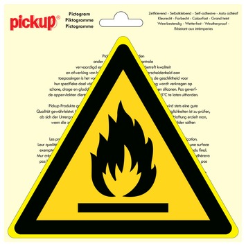 Het Pickup pictogram ontvlambare stoffen 20cm is een zelfklevende vinyl sticker. De geel met zwarte, driehoekige sticker is zowel binnen als buiten te gebruiken, zo lang u deze op een glad oppervlak bevestigt. De sticker hecht uitstekend, maar is ook goed te verwijderen zonder lijmresten achter te laten. Deze sticker maakt deel uit van een assortiment Pickup stickers. Deze bieden duidelijkheid op het gebied van gebod, verbod, veiligheid, waarschuwing, brandbestrijding, vluchtweg of andere informatie. Voor elk probleem is een passende oplossing te vinden. Kortom, het Pickup pictogram ontvlambare stoffen waarschuwt voor de aanwezigheid van ontvlambare stoffen op de betreffende locatie. Afmetingen: 20cm.