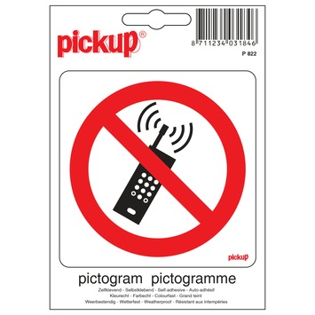Het Pickup pictogram verbod voor mobiele telefoons 10x10cm is een zelfklevende vinyl sticker. Dit verbodsbord met een pictogram van een mobiele telefoon is zowel binnen als buiten te gebruiken, zo lang u deze op een glad oppervlak bevestigt. De sticker hecht uitstekend, maar is ook goed te verwijderen zonder lijmresten achter te laten. Deze sticker maakt deel uit van een assortiment Pickup stickers. Deze bieden duidelijkheid op het gebied van gebod, verbod, veiligheid, waarschuwing, brandbestrijding, vluchtweg of andere informatie. Voor elk probleem is een passende oplossing te vinden. Kortom, het Pickup pictogram verbod voor mobiele telefoons wijst erop dat u op de betreffende locatie geen mobiele telefoon mag gebruiken. Afmetingen: 10x10cm.