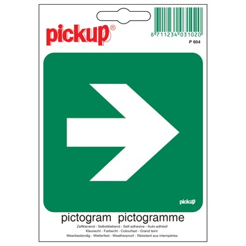 Het Pickup pictogram vluchtweg recht 10x10cm is een zelfklevende vinyl sticker. Deze groen met witte sticker met pijlpictogram is zowel binnen als buiten te gebruiken, zo lang u deze op een glad oppervlak bevestigt. De sticker hecht uitstekend, maar is ook goed te verwijderen zonder lijmresten achter te laten. Deze sticker maakt deel uit van een assortiment Pickup stickers. Deze bieden duidelijkheid op het gebied van gebod, verbod, veiligheid, waarschuwing, brandbestrijding, vluchtweg of andere informatie. Voor elk probleem is een passende oplossing te vinden. Kortom, het Pickup pictogram vluchtweg recht wijst mensen de richting van de vluchtweg. Afmetingen: 10x10cm.