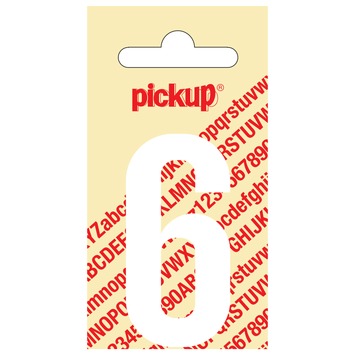 Het Pickup plakcijfer 6 wit mat 60mm is een zelfklevende sticker met het cijfer 6. De Pickup stickers zijn zelfklevend, maar ook goed te verwijderen zonder lijmresten achter te laten. U kunt deze plakletter zowel binnen als buiten gebruiken op een glad oppervlak. De Pickup plakletters en -cijfers zijn leverbaar in verschillende kleuren en maten. Niet alleen ter verduidelijking op werk of thuis, maar ook leuk als decoratie. Met het matwitte Pickup plakcijfer 6 heeft u een duidelijk, goed leesbaar cijfer dat u op elk gewenst glad oppervlak kunt plakken. Afmetingen: 60mm.