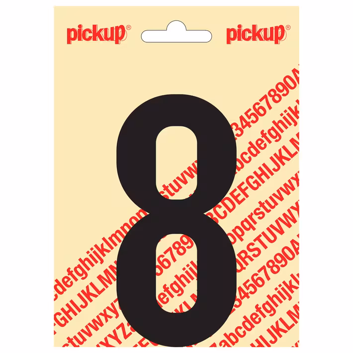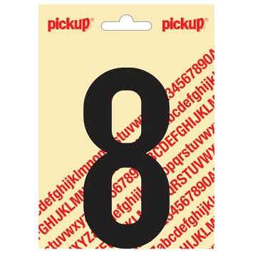 Het Pickup plakcijfer 8 zwart mat 120mm is een zelfklevende sticker met het cijfer 8. De Pickup stickers zijn zelfklevend, maar ook goed te verwijderen zonder lijmresten achter te laten. U kunt deze plakletter zowel binnen als buiten gebruiken op een glad oppervlak. De Pickup plakletters en -cijfers zijn leverbaar in verschillende kleuren en maten. Niet alleen ter verduidelijking op werk of thuis, maar ook leuk als decoratie. Met het matzwarte Pickup plakcijfer 8 heeft u een duidelijk, goed leesbaar cijfer dat u op elk gewenst glad oppervlak kunt plakken. Afmetingen: 120mm.