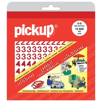 Met de Pickup plakcijfers 0-9 Helvetica rood 10mm plakt u zonder moeite cijfers op een glad oppervlak. De stickers zitten in een boekje, voorzien van een gebruiksaanwijzing en een siliconenvel met ruitjes. Hierop kunt u de rode cijfers netjes positioneren. Met het zelfklevende strookje brengt u vervolgens de cijfers over op het te beplakken voorwerp. De boekjes met plakletters en -cijfers zijn in verschillende kleuren, maten en lettertypes verkrijgbaar. U kunt ze zowel binnen als buiten gebruiken. Ze hechten prima, maar zijn ook goed te verwijderen zonder lijmresten achter te laten. De stickerboekjes zijn ideaal voor thuis, op kantoor, hobby of puur ter decoratie. Afmetingen: 10mm.