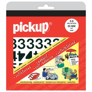 Met de Pickup plakcijfers 0-9 Helvetica zwart 20mm plak je zonder moeite cijfers op een glad oppervlak. De stickers zitten in een boekje, voorzien van een gebruiksaanwijzing en een siliconenvel met ruitjes. Hierop kan je de zwarte cijfers netjes positioneren. Met het zelfklevende strookje breng je vervolgens de cijfers over op het te beplakken voorwerp. De boekjes met plakletters en -cijfers zijn in verschillende kleuren, maten en lettertypes verkrijgbaar. Je kan ze zowel binnen als buiten gebruiken. Ze hechten prima, maar zijn ook goed te verwijderen zonder lijmresten achter te laten. De stickerboekjes zijn ideaal voor thuis, op kantoor, hobby of puur ter decoratie. Afmetingen: 20mm.