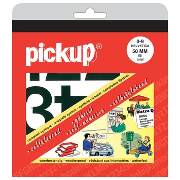 Met de Pickup plakcijfers 0-9 Helvetica zwart 50mm plakt u zonder moeite cijfers op een glad oppervlak. De stickers zitten in een boekje, voorzien van een gebruiksaanwijzing en een siliconenvel met ruitjes. Hierop kunt u de zwarte cijfers netjes positioneren. Met het zelfklevende strookje brengt u vervolgens de cijfers over op het te beplakken voorwerp. De boekjes met plakletters en -cijfers zijn in verschillende kleuren, maten en lettertypes verkrijgbaar. U kunt ze zowel binnen als buiten gebruiken. Ze hechten prima, maar zijn ook goed te verwijderen zonder lijmresten achter te laten. De stickerboekjes zijn ideaal voor thuis, op kantoor, hobby of puur ter decoratie. Afmetingen: 50mm.