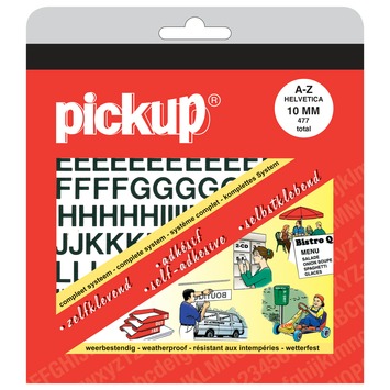 Pickup plakletter A-Z zwart 10mm plak je eenvoudig op elk glad oppervlak. Het meegeleverde siliconenvel met ruitjes help je de letters netjes recht te plaatsen. Hierdoor plak je nooit scheef. In de verpakking vind je ook een zelfklevend strookje. Hiermee breng je de letters simpel aan op het voorwerp dat je wilt beplakken. Pickup plakletter A-Z zwart 10mm hecht uitstekend en toch zijn de stickers goed te verwijderen zonder vervelende lijmresten achter te laten. Kortom, Pickup plakletter A-Z zwart 10mm is een prima keuze voor kantoor, thuis, hobby en decoratieve uitingen.