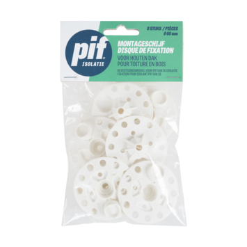 De PIF montageschijven 60 mm gebruik je om PIF DAK35 isolatie stevig vast te zetten tegen schuine daken. Sluit de dopjes goed af om koudebruggen in je dakconstructie te voorkomen. Je hebt ongeveer vier schijven nodig per vierkante meter. Voor een stevige bevestiging raden we 5x80 mm schroeven aan. Deze vind je eenvoudig via artikelnummer 465563 in de zoekbalk.