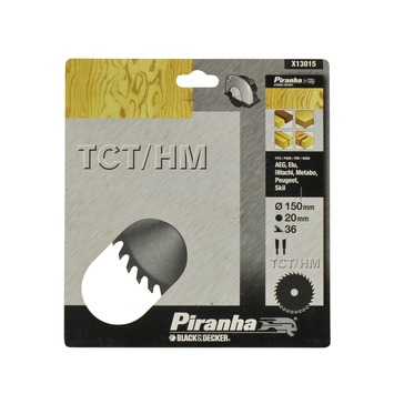 Het Piranha cirkelzaagblad X13015 is geschikt voor het zagen van hout, hardhout, spaanplaat en multiplex. Het TCT/HM zaagblad heeft een diameter van 150 millimeter, een asgat van 20 millimeter en voorzien van 36 tanden, voor fijne recht- en dwarszaagsneden. Het Piranha cirkelzaagblad X13015 is onder meer geschikt voor de AEG HK45A en SKIL 1850H cirkelzagen.
