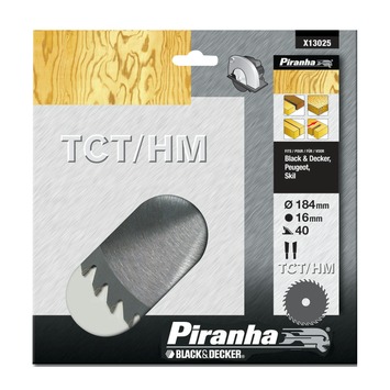 Het Piranha cirkelzaagblad X13025 is geschikt voor het zagen van hout, multiplex, mdf en spaanplaat. Het TCT/HM zaagblad heeft een diameter van 184 millimeter, een asgat van 16 millimeter en voorzien van 40 tanden, voor fijne recht- en dwarszaagsneden. Het Piranha cirkelzaagblad X13025 is onder meer geschikt voor de Black & Decker BD229 en de KS865 cirkelzagen.