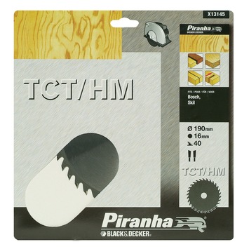 Het Piranha cirkelzaagblad X13145 is geschikt voor het zagen van hout, multiplex, mdf en spaanplaat. Het TCT/HM zaagblad heeft een diameter van 190 millimeter, een asgat van 16 millimeter en voorzien van 40 tanden, voor fijne recht- en dwarszaagsneden. Het Piranha cirkelzaagblad X13145 is onder meer geschikt voor de Black & Decker KS65K en Bosch PKS 65 cirkelzagen.