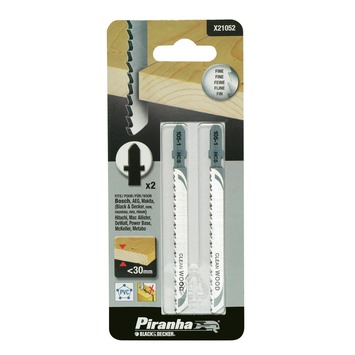 Het Piranha decoupeerzaagblad X21052 met U-schacht, is geschikt voor het zagen van hout en spaanplaat tot een dikte van 30 millimeter. Dit HCS zaagblad zorgt voor een fijn zaagresultaat. Het zaagblad past ook op de nieuwste decoupeerzagen met een universele aansluiting. Verpakking: 2 stuks.