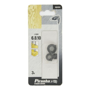 De Piranha dieptestoppen X66384 is een 3-delige set voor deuvelboren met diepte-aanslagen. De dieptestoppen hebben een diameter van 6, 8 en 10 millimeter.