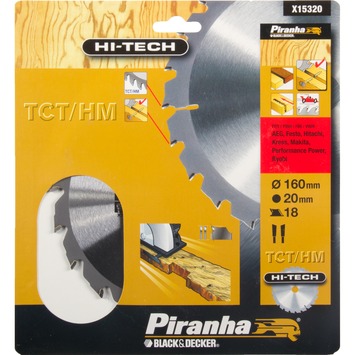 Het Piranha HI-TECH cirkelzaagblad X15320 is geschikt voor zwaar zaagwerk in zacht- of hardhout. Zelfs in hout met bijvoorbeeld specieresten of spijkers is zagen geen probleem. Het TCT/HM zaagblad heeft een diameter van 160 millimeter, een asgat van 20 millimeter en voorzien van 18 tanden, voor grove zaagsneden. Het zaagblad heeft een slijpbare wigvormige schouder, die de HM tandpunten beschermt tegen inslag van spijkers die in het hout zitten. Speciale luchtopeningen zorgen voor koeling en voorkomen vervorming van het zaagblad.