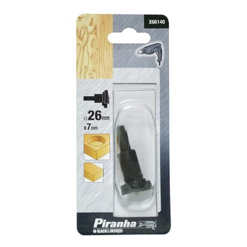 Met de Piranha komscharnierfrees X66140 kun je scharniergaten frezen in hout. De gehard stalen frees, met een diameter van 26 millimeter, freest tot een maximale diepte van 7 millimeter. De frees is te gebruiken op de meest gangbare boormachines.