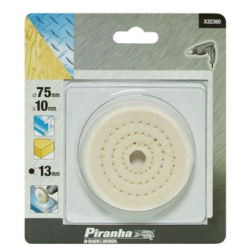 De Piranha polijstschijf X32360, gemaakt van katoen, met een werkdiameter van 75 millimeter, voor het polijsten van metaal, hout en marmer. De polijstschijf is te gebruiken in combinatie met de Piranha bevestigingsas X37015-XJ, die je eenvoudig op de boormachine kunt bevestigen.