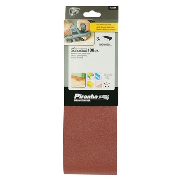 De Piranha schuurband X33286-XJ, afmeting 620 bij 100 millimeter, korrelgrootte 100 grove schuurafwerking, is geschikt voor bandschuurmachines. Verpakking: 3 stuks.