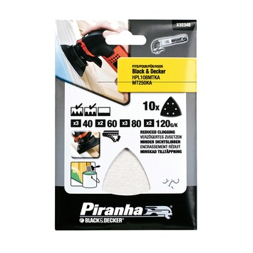 De Piranha schuurbladen X32348, korrelgroottes 40, 50, 80 en 120 voor grove tot en met middelgrove schuurafwerking. De perforatiegaatjes in het schuurblad zorgen voor een goede stofafzuiging, waardoor er minder stof in het schuurblad achter blijft, en voor een schonere werkomgeving. De Piranha schuurbladen X32348 zijn geschikt voor de Black & Decker MT250 en MT300. Verpakking: set 10 stuks (3x K40, 2x K60, 3x K80 en 2x K120).