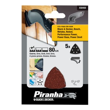 Het Piranha schuurpapier X32432, korrelgrootte 80 voor grove schuurafwerking. De perforatiegaatjes in het schuurblad zorgen voor een goede stofafzuiging, waardoor er minder stof in het schuurblad achter blijft, en voor een schonere werkomgeving. Het Piranha schuurpapier X32432 is geschikt voor deltaschuurmachines. Verpakking: 5 stuks.