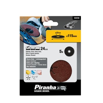 De Piranha schuurschijf X32150, diameter 115 millimeter, korrelgrootte 24 voor een zeer grove afwerking. De schuurschijf is in combinatie met de nylon steunschijf X32105 te gebruiken op de meest gangbare haakse slijpers. Verpakking: 5 stuks.