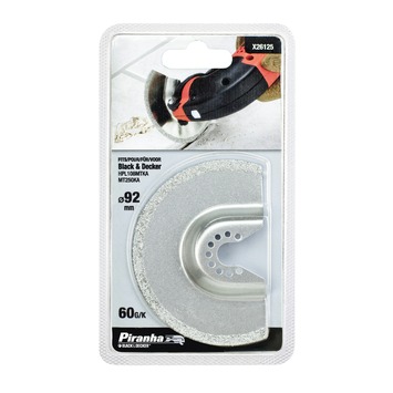 Het Piranha segmentzaagblad X26125, diameter 92 millimeter, is een hardmetalen HM zaagblad voor het zagen, frezen, slijpen van steen en keramische tegels. Het hardmetalen HM zaagblad is te gebruiken met de Black & Decker oscillerende Multitool MT250 en MT300.