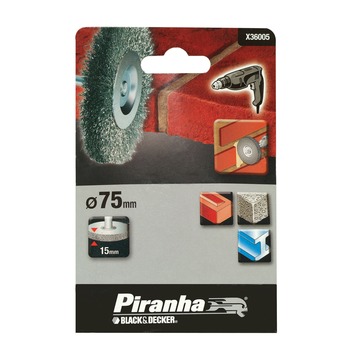 Met de Piranha staaldraadborstel X36005-XJ, met een diameter van 75 millimeter en hoogte van 15 millimeter, kun je beton, metaal en steen reinigen of schuren zonder de ondergrond te beschadigen. De staaldraadborstel is te gebruiken op de meest gangbare elektrische boormachines.