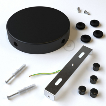 Strak design 120 mm. cilindrisch metalen plafondkap met 4 zijgaten (verdeeldoos) in een zwarte afwerking. Een 4-gaats metalen plafondkap gebruik je om een wand- of plafondlamp te maken voor 4 lichtbronnen. Deze kit bestaat uit de plafondkap, afdekdopjes voor de gaten die je niet gebruikt en een bevestigingsbeugel met schroeven en pluggen. Metaal is een materiaal wat geplaatst kan worden in meerdere omgevingen en past bij diverse stijlen: minimalistisch, klassiek of industrieel. Deze cilindrische plafondkap met 4 zijgaten is zeker geschikt in de situatie als: - je uit 1 lichtpunt tot 4 snoeren wilt laten komen (de gaten zijn overigens af te dekken met bijgeleverde dopjes) - je een lichtpunt wilt gebruiken als verdeelpunt. Een creatieve tip: omdat de gaten aan de zijkant zitten, kun je de snoeren netjes langs de wand of het plafond geleiden met de los verkrijgbare snoer V-haak of kabelklemmen.