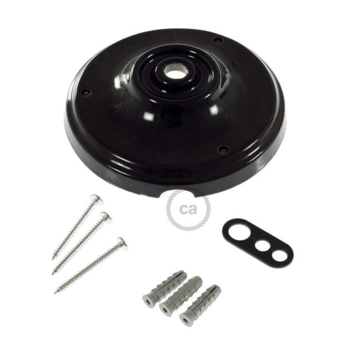 Deze porseleinen plafondkap wordt gebruikt om een wand- of plafondlamp te monteren. Deze plafondkap wordt geleverd met schroeven, pluggen en een trekontlasting. Het porselein, waarvan het mengsel een aanzienlijk percentage kaolien bevat, heeft een buitengewoon zwarte kleur; na geschilderd, op hoge temperatuur gebakken en geglazuurd te zijn, geeft het oppervlak een echt vol en levendig resultaat. Deze porseleinen plafondkap kit is zeker geschikt in de volgende situatie: - Je hebt een enkele hanglamp nodig, d.w.z. één lamp - Je geeft de voorkeur aan een eenvoudige, klassieke look en feel. Een creatieve tip: - kies voor bij je plafondkap een bijpassende porseleinen fitting