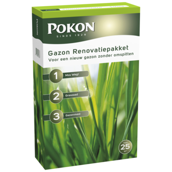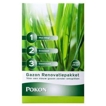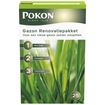 Het Pokon Gazon Renovatiepakket 3-in-1 bevat een mosbestrijder, graszaad en gazonmest. Met deze producten heb je alles wat je nodig hebt om het gazon te herstellen na de winter, zodat je niet opnieuw een gazon hoeft aan te leggen. Mos bestrijd je het best van februari tot en met april en van augustus tot en met september. We adviseren graszaad te zaaien van maart tot september. Indien mogelijk is het aan te raden in de periode april/mei of augustus/september in te zaaien.