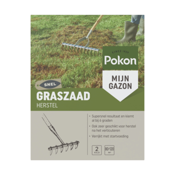 Met Pokon graszaad herstel SOS 2 kg herstel je snel je gazon, zowel na het verticuteren als bij kale plekken. Dit speciale graszaad zorgt ervoor dat je gazon snel weer egaal groen wordt, met resultaten al binnen 1 week! Het zaad kiemt zelfs bij lage temperaturen van 6 graden Celsius, waardoor het ideaal is voor gebruik in de koudere maanden, zoals de herfst of winter. Voor een optimale ontkieming is het belangrijk dat de bodemtemperatuur minstens 6 graden Celsius is en de buitentemperatuur tussen de 15 en 25 graden ligt.