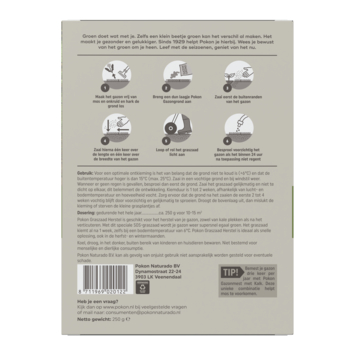 Zaai het graszaad gelijkmatig, maar niet te dicht op elkaar, om te voorkomen dat de ontwikkeling wordt belemmerd. De kiemduur varieert van 1 tot 2 weken, afhankelijk van de temperatuur en vochtigheid. Houd de grond de eerste 2 tot 4 weken vochtig door regelmatig en gelijkmatig te sproeien. Maai en hark het gazon vooraf om mos en onkruid te verwijderen en breng een dun laagje Pokon Gazongrond aan. Zaai eerst de randen van je gazon, en zaai daarna over de lengte en breedte. Rol of loop het graszaad licht aan en besproei voorzichtig als er binnen 24 uur geen regen valt. Met 250 gram bedek je 10 tot 15 vierkante meter.