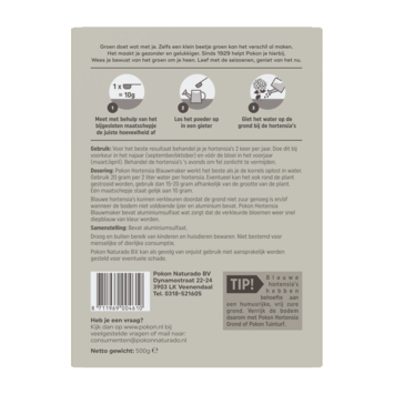 Wil je dat je hortensia’s weer prachtig diepblauw bloeien? Pokon Hortensia Blauwmaker is de oplossing! Dit product herstelt de blauwe kleur van hortensia’s die verkleurd zijn door een te hoge pH in de grond of een tekort aan ijzer en aluminium. De werking van aluminiumsulfaat zorgt ervoor dat je bloemen weer die mooie, intense blauwe tint krijgen. Gebruik het poeder eenvoudig door het op te lossen in water en dit mengsel over de grond rond je hortensia’s te gieten. Voor het beste resultaat behandel je de planten twee keer per jaar: in het najaar (september/oktober) en vóór de bloei in het voorjaar (maart/april). Het is belangrijk om de hortensia’s 's avonds te behandelen, wanneer het zonlicht minder fel is. De verpakking is voldoende voor 25 planten en met het meegeleverde maatschepje meet je eenvoudig de juiste hoeveelheid af.