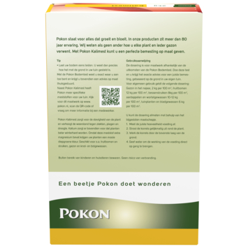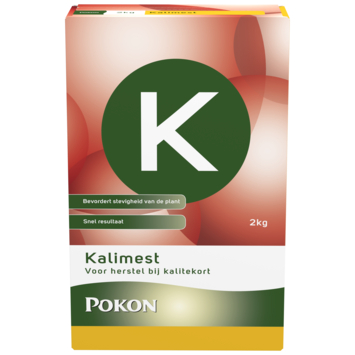 Pokon kalimest is de perfecte meststof voor het herstellen van kalitekort en het bevorderen van de stevigheid van je planten. Kalium versterkt niet alleen de plant, maar verhoogt ook de weerstand tegen ziektes, plagen en droogte. Bovendien helpt kalium je planten beter bestand te maken tegen de winter. Deze meststof bevat extra magnesium, waardoor je planten een diepe, groene kleur krijgen. Het is ideaal voor fruitbomen, struiken, gazon en knol- en bolgewassen. Je kunt het gebruiken van maart tot oktober. Strooi de korrels gelijkmatig rondom de plant en werk ze door de bovenste laag van de grond. Geef daarna water om de werking direct op gang te brengen. De verpakking is goed voor verschillende toepassingen: 2 kg per 100 m² voor gazon in het najaar, 12 kg per 100 m² voor fruitbomen, 8 kg voor bessenstruiken, en 10-12 kg voor aardappelen en wortelgewassen.