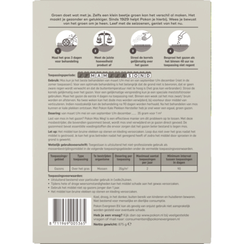 Ben je het mos in je gazon beu? Pokon Mos Weg! biedt de oplossing! Deze mosbestrijder bevat gazonmest en bestrijdt mos snel en effectief. Binnen één week zul je het resultaat al zien: het mos wordt zwart/bruin en sterft af. Daarnaast bevat de gazonmest essentiële voedingsstoffen die je gazon versterken, waardoor het beter bestand is tegen mosgroei. Gebruik het product het beste tussen maart en mei of september en december, wanneer de omstandigheden ideaal zijn voor een effectieve behandeling. Maai het gazon voorafgaand aan de toepassing, maar laat het de eerste vier dagen na behandeling met rust. Binnen twee weken kun je het dode mos verwijderen met verticuteren. Let op: vermijd contact met stenen en kleding, omdat het middel vlekken kan veroorzaken.