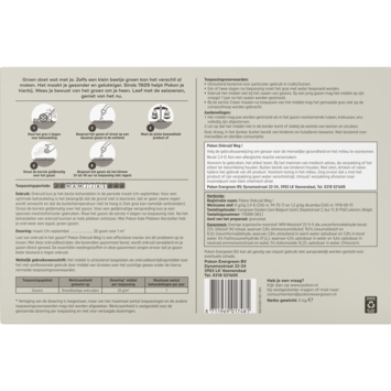 Heb je onkruid in je gazon? Met Pokon Onkruid Weg! pak je dit probleem snel en effectief aan. Deze onkruidbestrijder verwijdert onkruid zoals boterbloem, madeliefje, klaver en paardenbloem uit je gras en bevat daarnaast gazonmest. De gazonmest levert essentiële voedingsstoffen die ervoor zorgen dat je gazon sterker wordt en beter bestand is tegen onkruid. Het ideale gebruiksperiode is van maart tot september, wanneer de grond niet bevroren is en de temperatuur niet te hoog. Maai je gazon vier dagen voor gebruik en zorg ervoor dat er geen regen wordt verwacht. Strooi de korrels gelijkmatig over een dauwnat gazon en besproei het gazon als er binnen 24 tot 48 uur geen regen valt. Dit helpt je om een gezond, groen gazon te behouden.