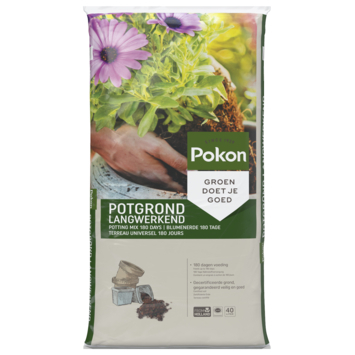 Optimaliseer de groei van je planten met Pokon potgrond langwerkend. Deze potgrond biedt een uitgebalanceerde voedingsbasis dankzij de speciale samenstelling van hoofdbestanddelen die de planten zowel ondergronds als bovengronds ondersteunen. De unieke kunsthars omhulde meststofkorrels zorgen ervoor dat je planten gedurende 180 dagen continu voeding krijgen. Na deze periode wordt het kunsthars op een natuurlijke manier afgebroken door bodemorganismen. Begin je pot met een laag hydrokorrels (20-25% van de pot), voeg dan de potgrond toe en dompel je plant in water voordat je deze in de pot plaatst. Vul verder aan met potgrond en druk het geheel licht aan. Geef je plant ruim water en houd de vochtigheid goed in de gaten. Na een half jaar kun je opnieuw voeden. Deze verpakking van 40 liter is ideaal voor zowel kamerplanten als balkonbakken.