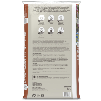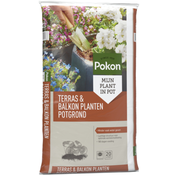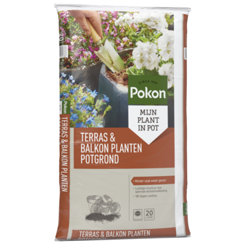 Pokon Potgrond Terras & Balkon Planten is de beste voedingsbodem voor al je terras- en balkonplanten. De grond is samengesteld met de meest hoogwaardige grondstoffen, zoals turfstrooisel, tuinturf en plantenvoeding. Bovendien is er extra TerraCottem en een PEFC-gecertificeerde houtvezel aan de potgrond toegevoegd. TerraCottem zorgt voor een luchtige structuur en water en voedingstoffen worden veel beter vastgehouden, hierdoor hoef je minder vaak water te geven. PEFC-gecertificeerde houtvezel maakt de grond luchtiger, waardoor de wortels zich beter kunnen ontwikkelen. Planten met goed ontwikkelde wortels kunnen beter water en voeding opnemen, waardoor ze meer weerstand hebben tegen ziektes en plagen. Op deze manier draagt houtvezel bij aan een betere groei en mooiere bloei van je planten. Door de toevoeging van gemalen houtvezel kan tijdelijk enige schimmelvorming optreden. Dit kan absoluut geen kwaad voor plant, mens en dier. Het draagt zelfs in positieve zin bij aan het actieve bodemleven.