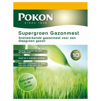 Pokon Supergroen Gazonmest 1 kg kan het gazon in jouw tuin laten groeien als nooit tevoren. Rondrennende kinderen of spelende honden betekenen een belasting van het gazon, waardoor dit aan schoonheid inboet. Door Pokon gazonmest te gebruiken, geef je het gras de volle groene kleur terug. Het hoge stikstofgehalte speelt hierbij een grote rol. Naast voldoende stikstof, dat de groei bevordert, bevat deze gazonmest magnesium en ijzer. In een goed gevoed gazon hebben onkruid en mos minder kans om te groeien. Met als gevolg dat het gras daadwerkelijk groen blijft zonder onkruid. Nadat je de mest over het gras hebt gestrooid, adviseren wij binnen 24 uur het gazon te besproeien met water. Tenzij de regen het gras inmiddels van vocht heeft voorzien. We adviseren de gazonmest niet te gebruiken bij temperaturen boven de 25 graden. Het optimale resultaat bereik je in de maanden april tot en met augustus.