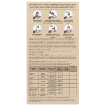 Pokon Bio Tegen Insecten Polysect GYO bestrijdt snel en effectief zowel de eitjes, larven als adulten (volwassen insecten) van bladluizen, schildluizen, dopluizen, spintmijten en witte vliegen. Na behandeling kunnen groenten en fruit zonder problemen gegeten worden. Pokon Tegen Insecten Polysect GYO kan van februari tot oktober gebruikt worden, zodra de eerste insecten of symptomen waarneembaar zijn. Niet gebruiken bij hoge temperaturen (boven 25 graden Celsius). Bij voorkeer ’s ochtends of ’s avonds gebruiken, om fel zonlicht te vermijden. De aangetasten bladeren (boven- en onderkant), stengels en de stam bespuiten tot afdruipen. Dode insecten kunnen enkele dagen op de bladeren blijven liggen voor ze eraf vallen. Maximaal 1-3 toepassingen per jaar, met een interval van minimaal 7 dagen. Was de drukspuit af na gebruik en verwijder gemorste vloeistof zodat er geen vlekken kunnen ontstaan.