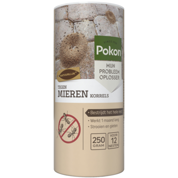 Pokon Tegen Mieren Korrels 250 gr. Mieren komen meestal voor bij warm weer en mierennesten zijn te herkennen aan zandhoopjes tussen de tegels. Dit kan zorgen voor verzakking van tegels en daarom zal je dit moeten bestrijden. Mierenpoeder is een natuurlijke en effectieve oplossing op basis van spinosad om een heel mierennest uit te roeien. Het is mogelijk om het middel te strooien of op te lossen in water en daarna in de nestingangen te gieten. Gebruik bij strooien 20 gram en bij gieten 40 gram gemengd in 2 liter water. De mierenkorrels zijn effectief tot een maand na toepassing, daarna kan je een tweede keer toepassen. Dit product is alleen geschikt om buiten te bestrijden.