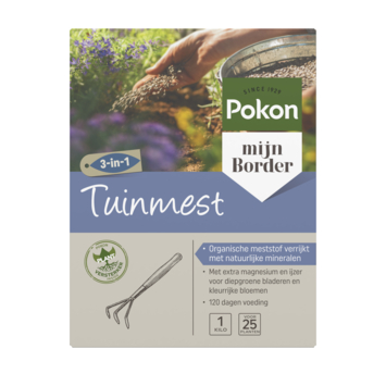 Zorg dat je tuin in volle glorie staat met Pokon tuinmest 1 kg, een hoogwaardig product dat je planten voorziet van alles wat ze nodig hebben om te gedijen. Met zijn 3-in-1 werking levert deze meststof voeding, verbetert de bodem en versterkt je planten, waardoor ze sterk en gezond blijven. Organische bestanddelen zoals zeoliet en algen plus magnesium en ijzer zorgen ervoor dat bladeren prachtig groen worden. De mest biedt weerstand tegen ziektes, plagen en kou. Geschikt voor de maanden maart tot en met augustus, krijg je tot 120 dagen langdurige voeding. Gebruik deze meststof tweemaal per jaar voor het beste resultaat. Met behulp van het maatschepje meet je de juiste hoeveelheid, verspreid de korrels gelijkmatig rondom je planten, werk ze in de bovenlaag van de grond en geef voldoende water om alles in gang te zetten. Houd de temperatuur in de gaten en vermijd gebruik bij hitte boven 25 graden.